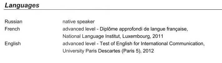 What you can do in this section is mention any other language you speak (besides your mother tongue) and how well you speak it (your level of proficiency).