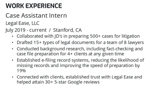 [Position] [Company] [Location] [Start and end date of an internship] [A bullet point list containing the crucial responsibilities and achievements within the role]