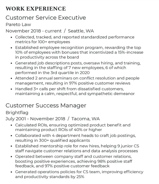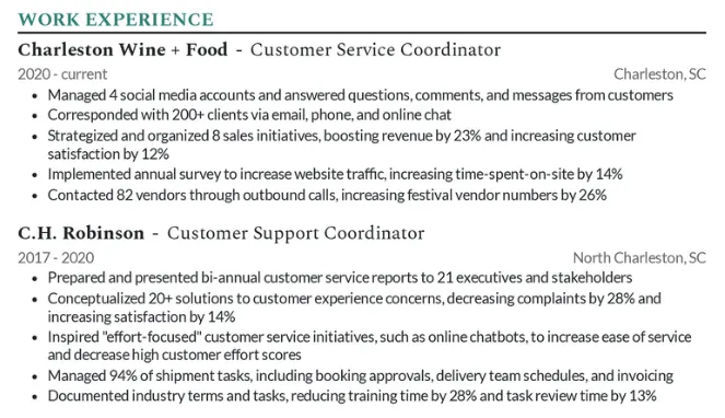 Another way to make your work experience section even more impressive is by adding numbers and percentages. Instead of being too broad and general, use exact numbers to quantify your accomplishments and make them more credible. Check out the following customer service resume sample to see these tips in action: