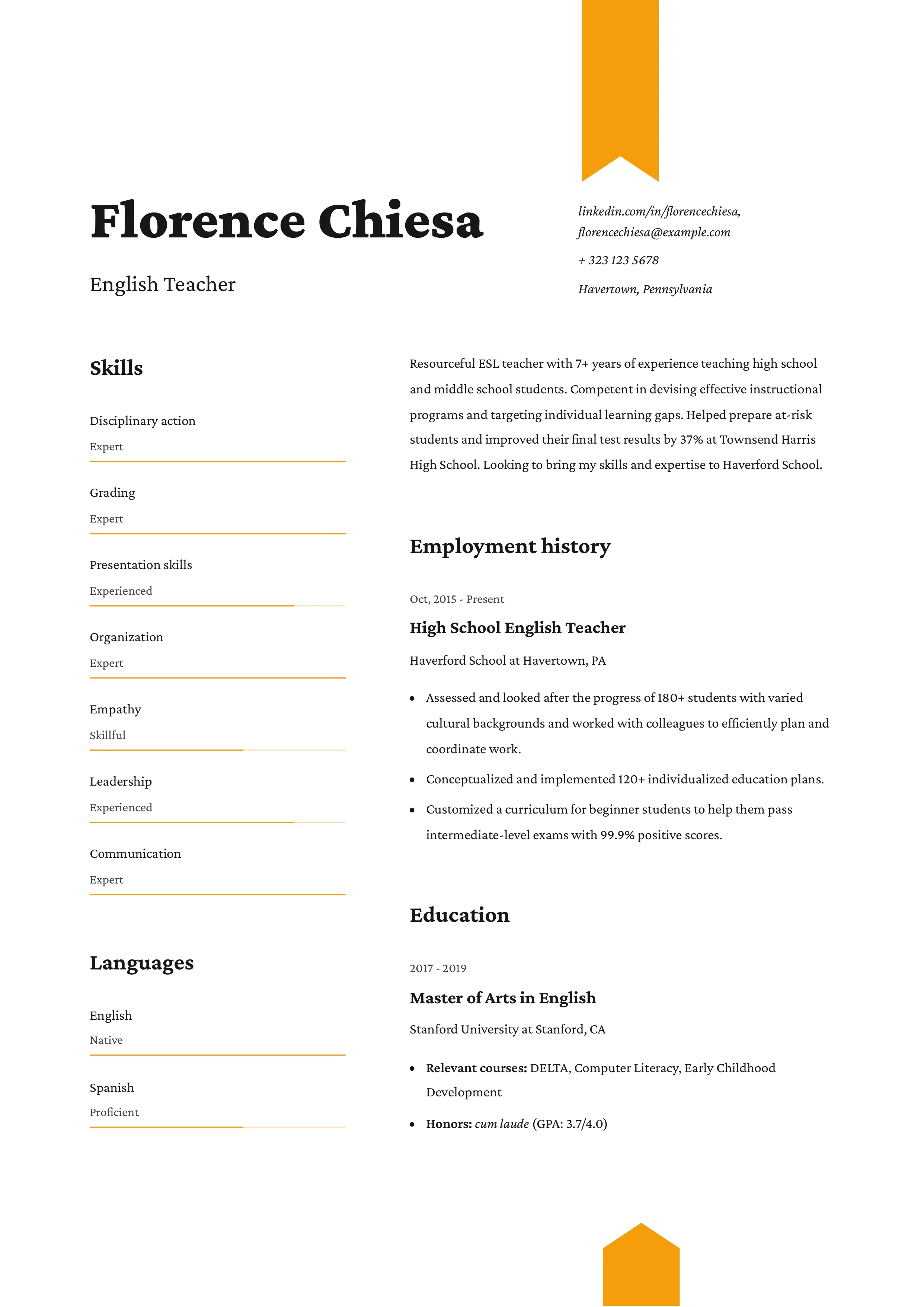 Just like with the work experience section, you can add bullet points to this part to highlight some of your most prominent accomplishments. Here’s how a seasoned teacher with a master’s degree would write their education section: